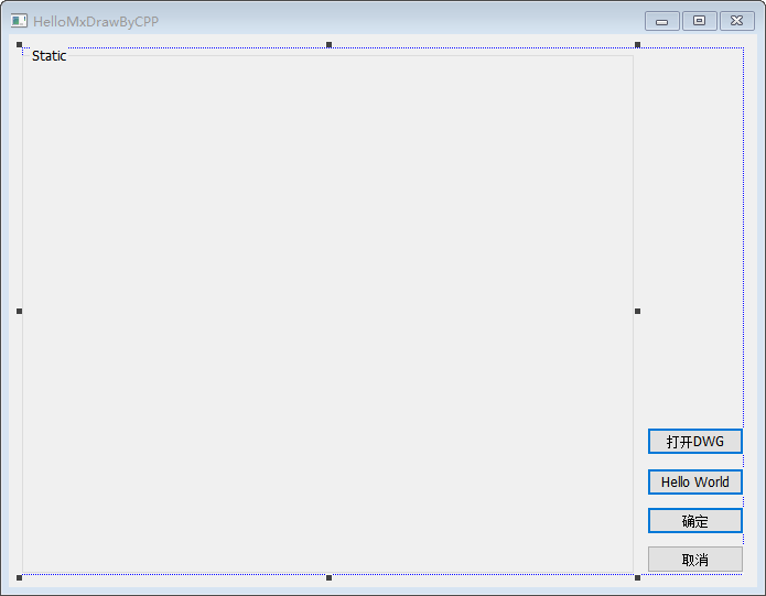 在面板中添加一个Group Box来制定CAD控件界面大小、添加两个按钮,分别为“打开DWG”和“Hello World”,如下: